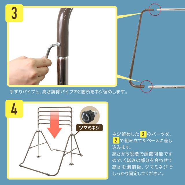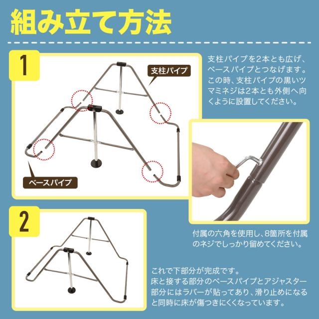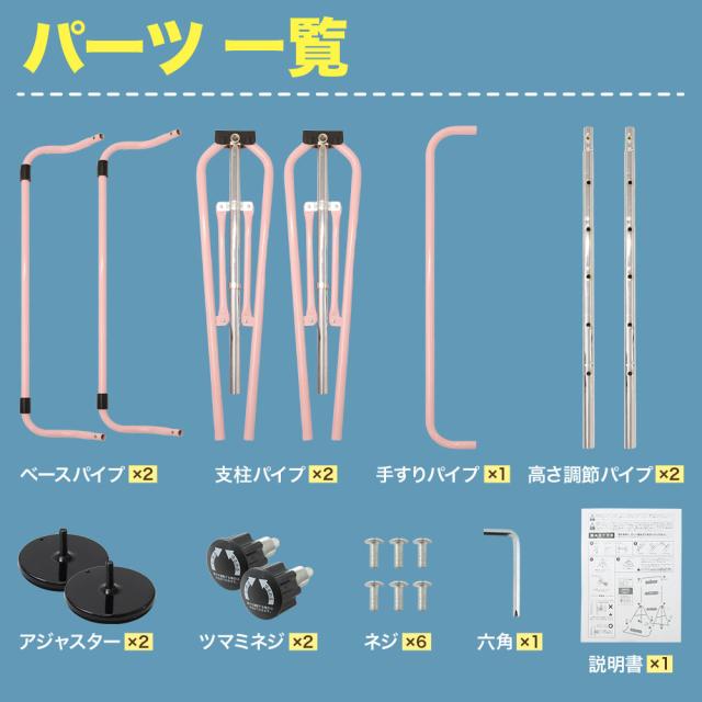 ベースパイプ×2 支柱パイプ×2 手すりパイプ×1 高さ調節可能パイプ×2 ワッシャー×10 ネジ×10