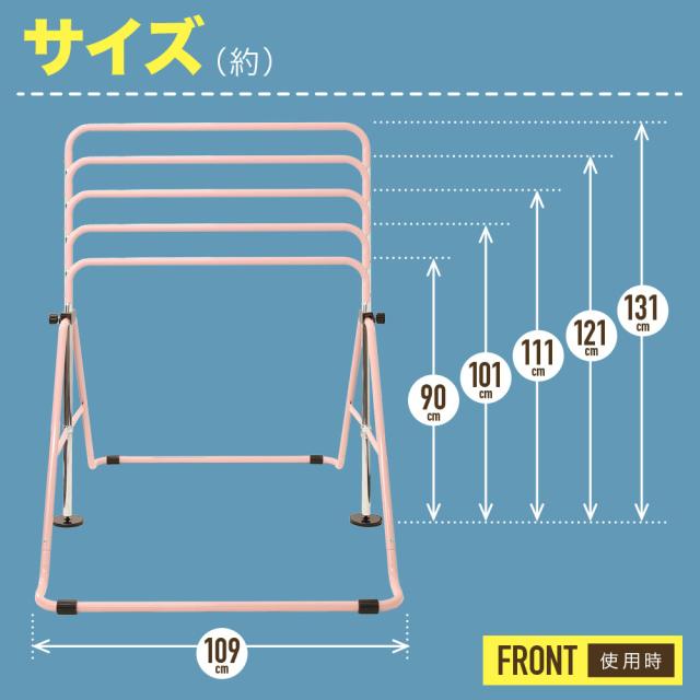 段階に調節:鉄棒の高さが86cmから127cmまでの等間隔で高さ調節できます。