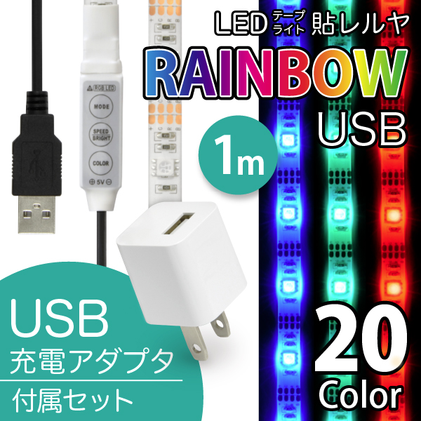 LED USB 照明 テープライト【USB電源アダプタ付】 貼レルヤ(レインボー 1m)20色カラフル照明 貼り付けて使える粘着テープ付