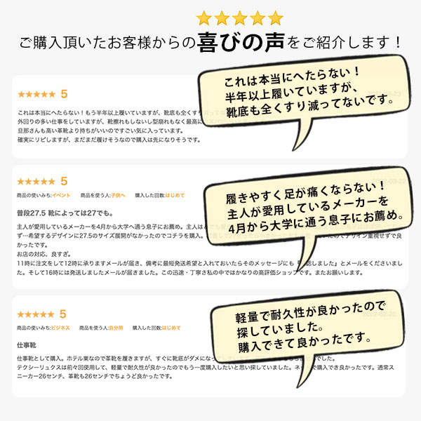 | こちらの商品は【一般的な革靴サイズ(幅広3E相当)】です。普段お履きの革靴サイズをお選び下さい。 幅広設計なので、甲高・幅広の方も通常のサイズをお選び下さい。 【男性スタッフKEN(169cm) 普段のサイズは、革靴26.0cm/日本製スニーカー26.5cmです】 私のジャストサイズは26.0cmでした。靴下を履いて、程よいフィット感のあるサイズです。 (個人差もございますので、目安とお考えください。) レビュー商品の評価: