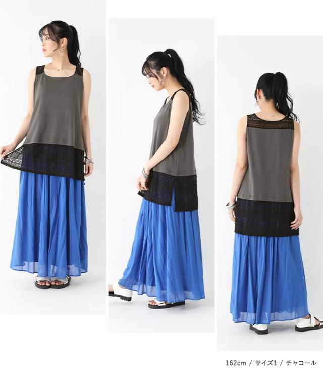 『配色裾レースタンクトップ』 ※メール便可※【10】[タンクトップ レディース トップス カットソー ノースリーブ インナー キャミタンク 綿100% 肩レース 配色 重ね着 レイヤード ゆったり 大きいサイズ 体型カバー 着回し 春 夏 秋 冬]
