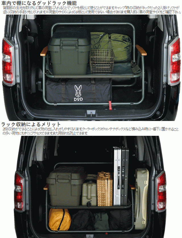 DOD ソファ 2人掛けソファ ワンタッチ 車載棚 耐荷重200kg 棚 車内 ラック収納 折りたたみチェア アウトドア キャンプ グッドラックソファ CS2-500-KH カーキ メーカー直送