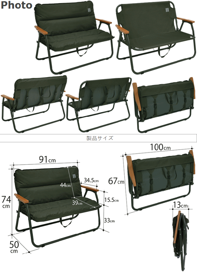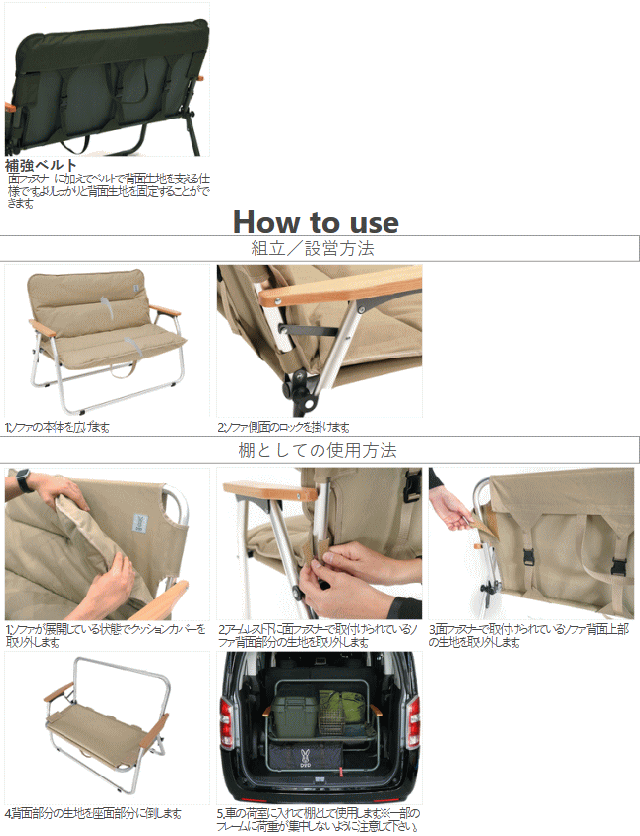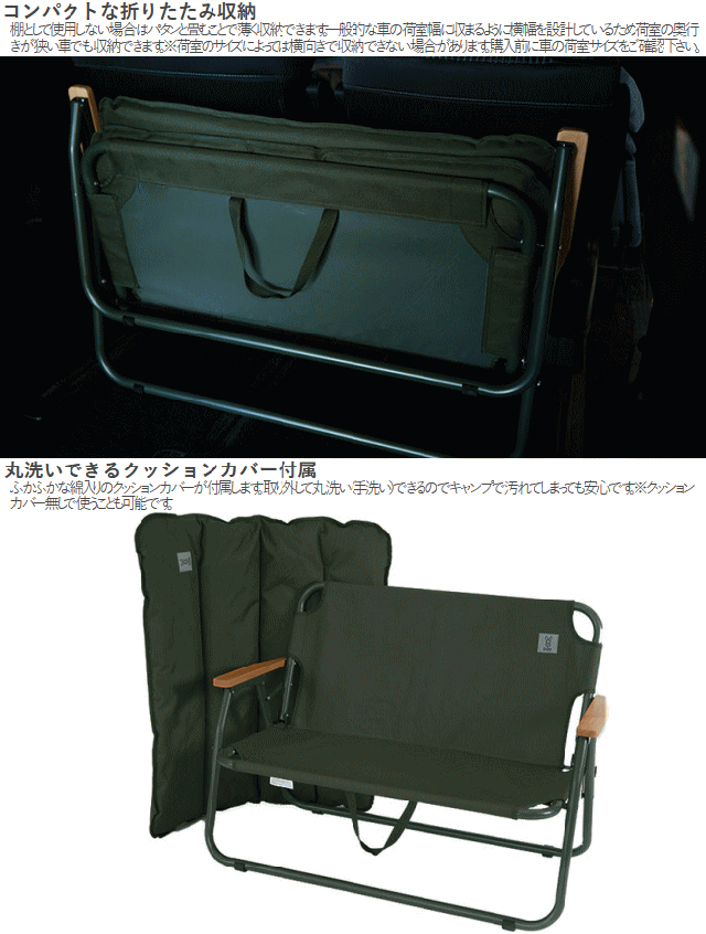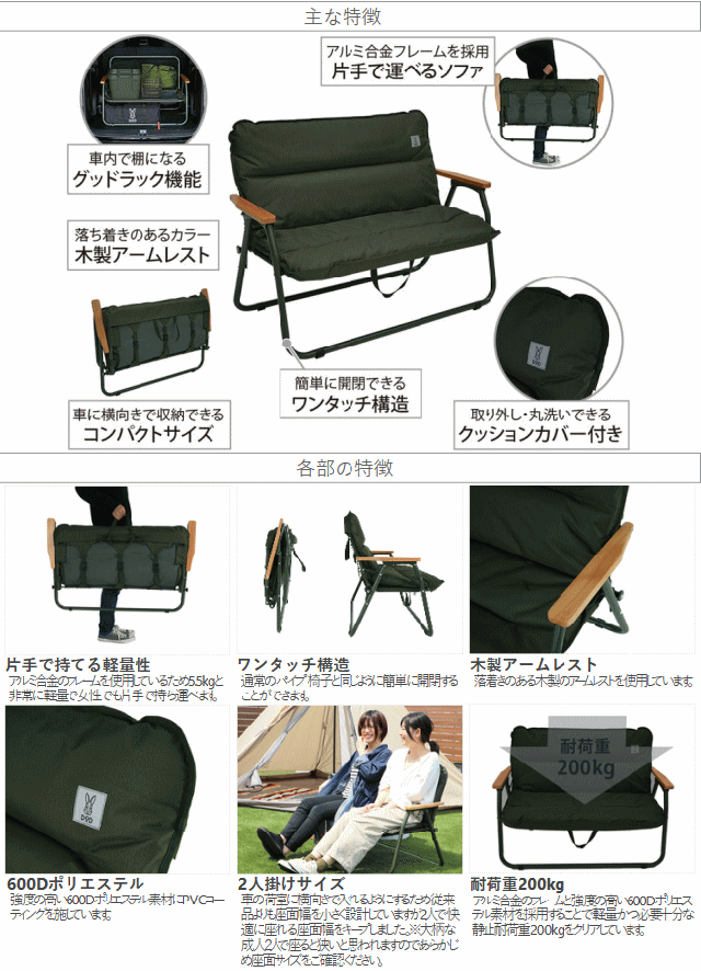 車の荷室に棚をつくる。キャンプ用品の車内収納の手助けをするキャンプがぐっと豪華になる2人掛けソファ。片手で運べるソファの最大のネックだった車内での収納のしづらさを改善し逆に収納の手助けをする棚として使用可能にしました。ふかふかな綿入りのクッションカバーが付属します。取り外して丸洗いできるのでキャンプで汚れてしまっても安心です。※クッションカバー無しで使う事も可能です。■カラー:カーキ■サイズ約W100×D50×H74cm■収納サイズ約W100×D13×H67cm■総重量約5.5kg■材質:アルミ合金、600Dポリエステル(PVCコーティング)、木、スチール(補強パイプ)■静止耐荷重200kg※荷室のサイズによっては棚として使用できない場合や横向きに収納できない場合があります。購入前に車の荷室サイズをご確認下さい。棚として使用する際には一部のフレームに荷重が集中しないように注意して下さい。生産工程上、フレームに小傷が発生している場合がございます。予めご了承下さい。