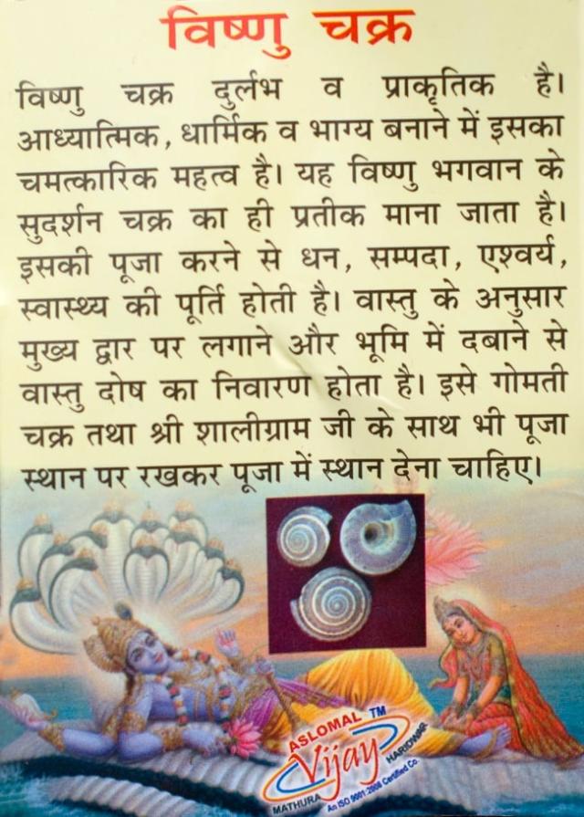 ヴィシュヌ神がいつも右上の手に持つ円盤のようなもの、最も重要な武器でありヴィシュヌ神のシンボルとも言える円盤(スダルサナチャクラ)。この非常に希少な天然貝は、そのスダルサナチャクラに形が似ている事から、ヴィシュヌチャクラと呼ばれ、持っていると幸運や富、心身の健康、繁栄などを招くとされています。