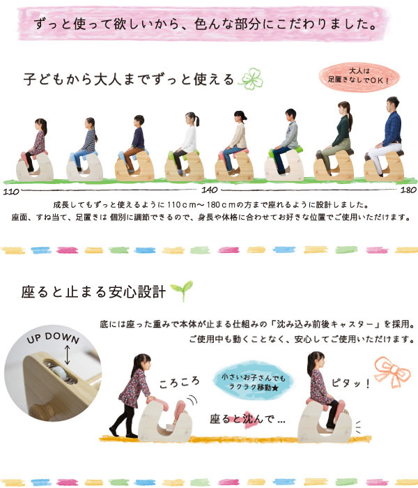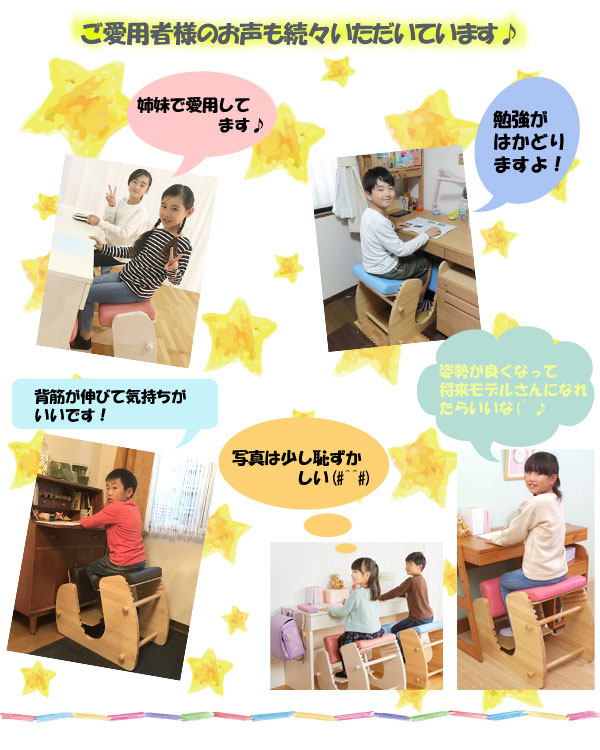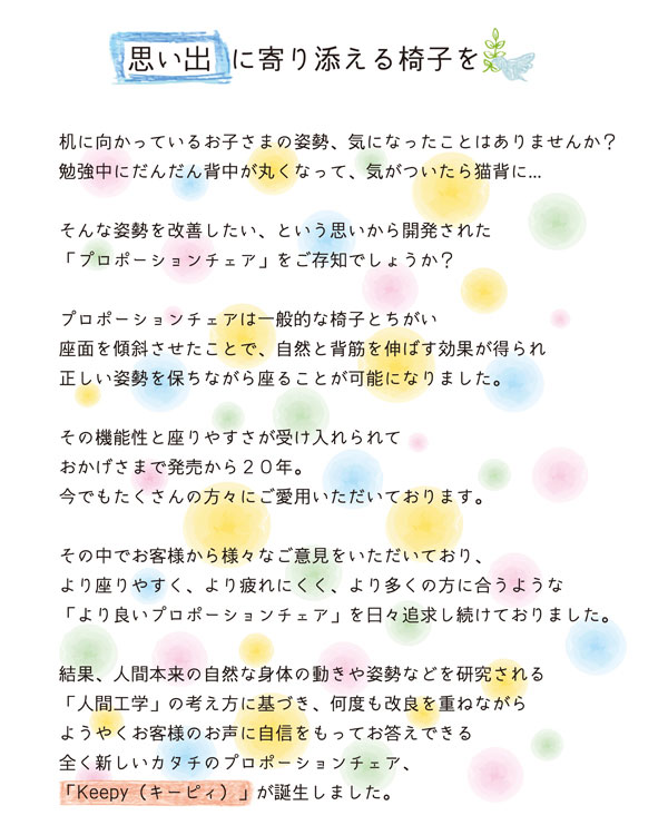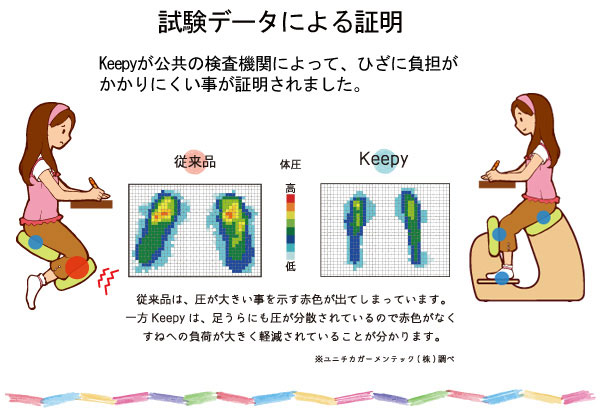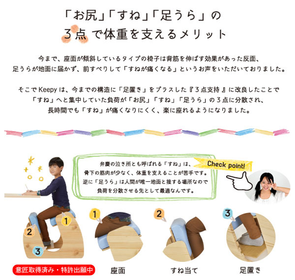 | 説明 | プロポーションチェア『Keepy』は膝に負担をかける事が少なく、背筋を伸ばして座れる椅子となっております。 身長110cm〜180cmの方までご使用できますので長期間ご使用いただくことができます。 膝に負担をかけずに背筋を伸ばせる形状の椅子は現在特許申請中となります。 『keepy』で正しい姿勢をKeepしましょう。 |