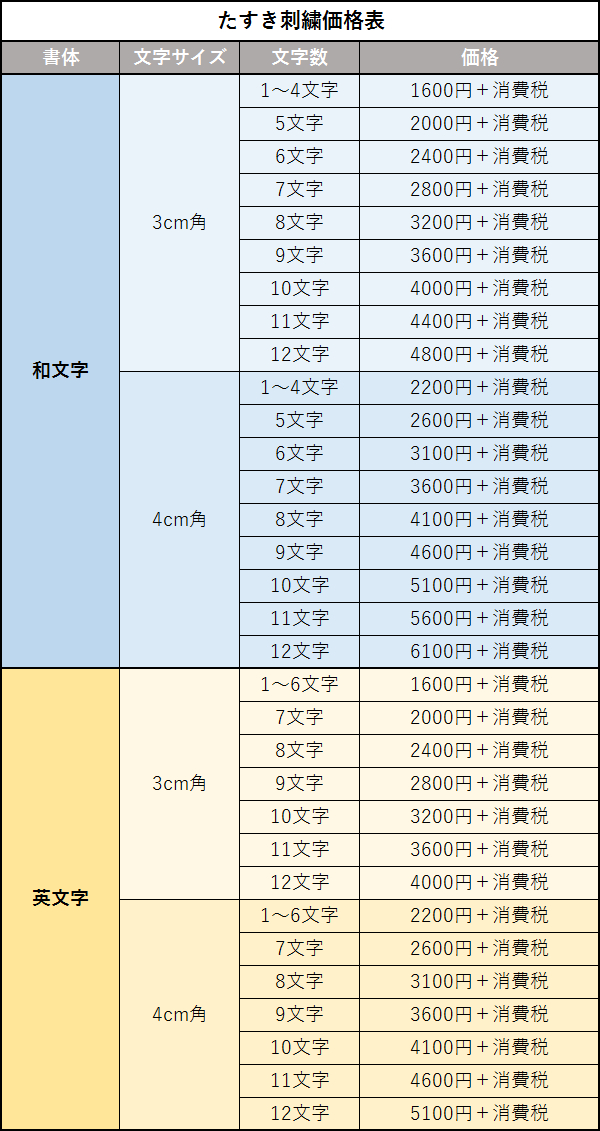 ※文字数、文字サイズにより価格が異なります。ご希望の文字数と文字サイズをお選びの上、買い物かごにお入れください。