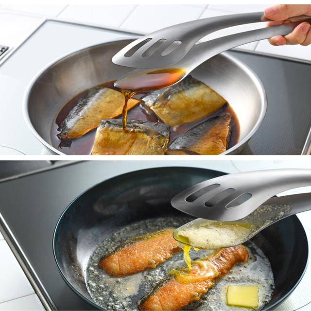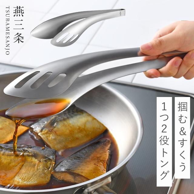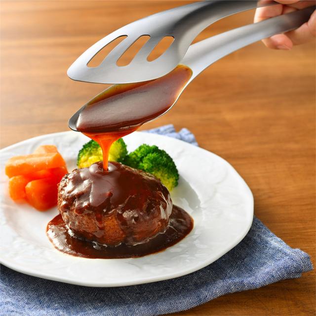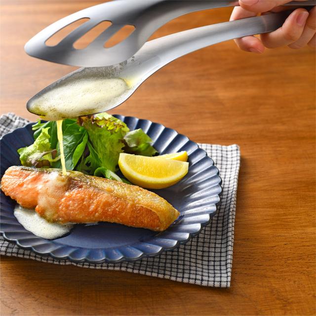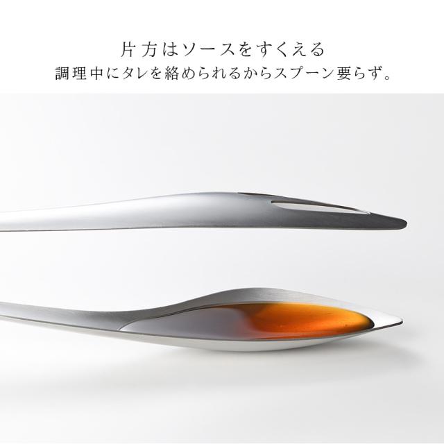 大振りな食材もしっかりつかみ、そのままタレやソースをすくって絡めることができる、leye(レイエ)の1つ2役のこだわりトング。しっかり働く機能性と、燕三条の職人が作り上げた艶やかなステンレス一体成型でルックスの美しさも兼ね備えています。