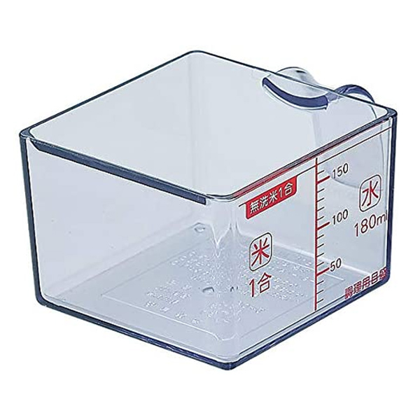 無洗米用の目盛りが付いた計量カップです。精白米ならすりきり1合、無洗米なら目盛りのラインで1合のお米が量れます。また調理用の水の計量カップとしても使えます。水は180mlまで、10ml単位で計量出来ます。
