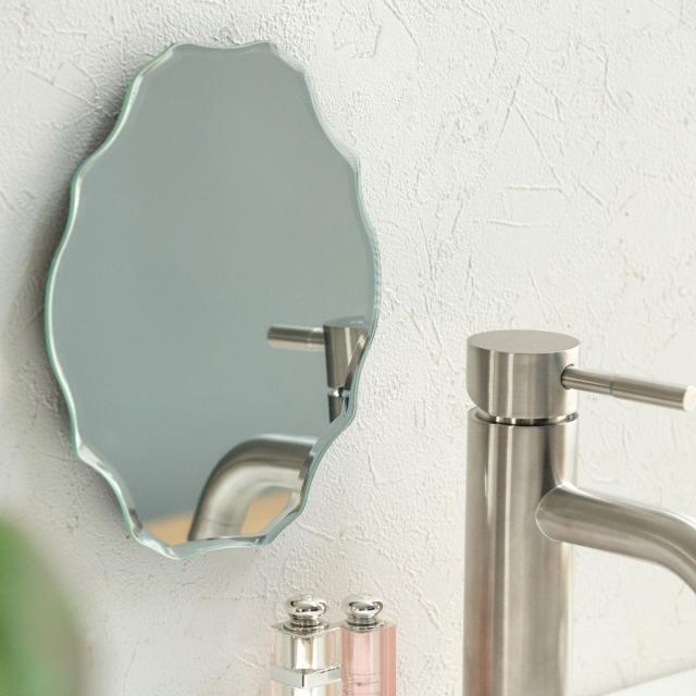 4mm厚ミラーのエッジを一つ一つ手作業で面取りされています。丁寧な作業を施された縁は安全面でも安心です。ウェーブ状のアンティークな曲線が美しく、光を受けると輝き、棚の上や玄関先を彩るインテリアにもなります。