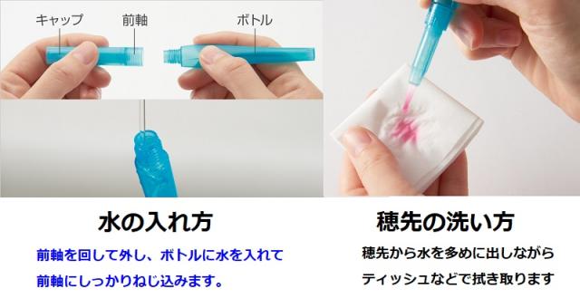 みず筆…軸の部分に水を入れて使用します。描画から筆洗いまで1本で行えますので携帯にも便利。