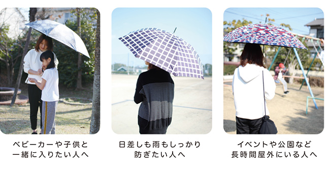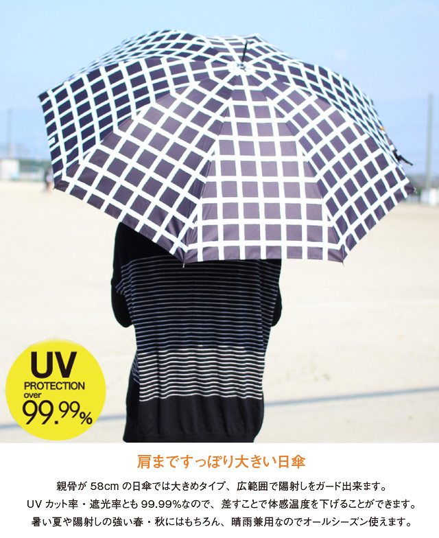 親骨が58cmの日傘では大きめタイプ、広範囲で陽射しをガード出来て、ベビーカーや子供と一緒に入れるサイズです。UVカット率・遮光率とも99.99%なので、差すことで体感温度を下げることができます。暑い夏や陽射しの強い春・秋にはもちろん、晴雨兼用なのでオールシーズン使えます。