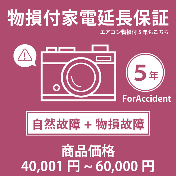 家電・エアコン物損付き5年延長保証 自然故障+物損故障 税込商品価格 40,001〜60,000円 迄の商品が対象 対象商品と同時に購入下さい