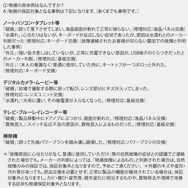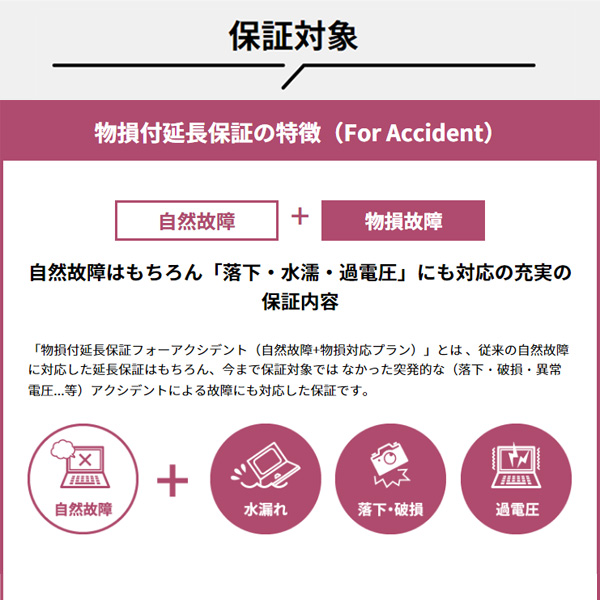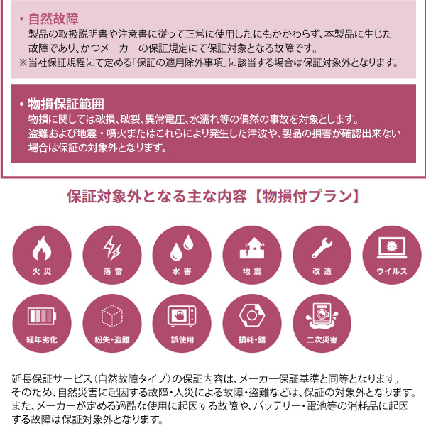 こちらは自然故障に加えて、突発的なアクシデント(落下・水漏れなど)による物損故障にも対応した保証です。