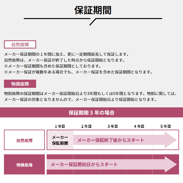 ●物損故障の保証期間はメーカー保証開始日より5年間となります。物損に関しては、メーカー保証の対象となりませんので、メーカー保証開始日より保証開始となります。