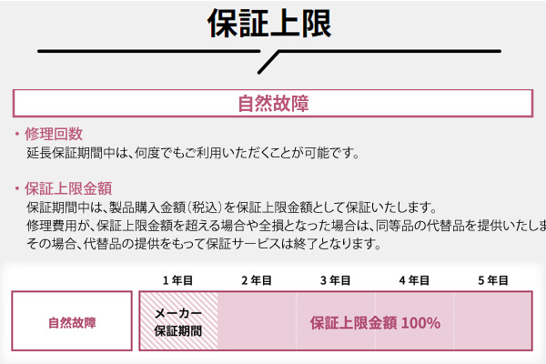 (1回の修理が商品金額(税込)を超える場合は全損となります。) - 延長保証サービスの保証上限金額は、自然故障の場合商品金額(税込)までで経過年数による低下はなし。