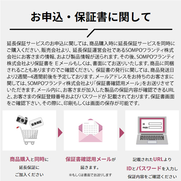 ●保証書の発行については、当店よりSOMPOワランティ株式会社へお客様情報をお送りします。その後、SOMPOワランティ株式会社より保証書を Eメールもしくは、書面にてお客様へお送りいたします。