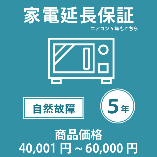 家電・エアコン5年延長保証 自然故障保証タイプ 税込商品価格 40,001〜60,000円 までの商品が対象です 対象の商品と同時購入が必要です