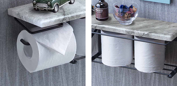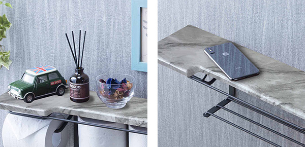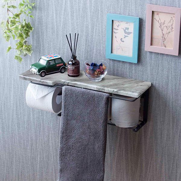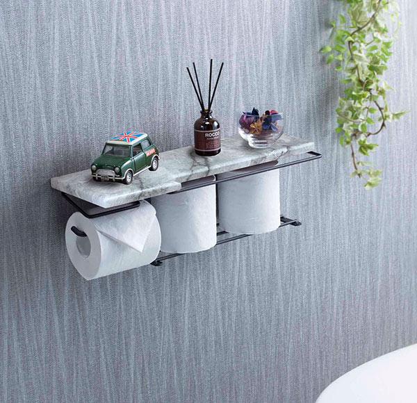 大理石調のお洒落なトイレットペーパーホルダーです。ペーパーロールをストックしておくことが出来る棚付きです。シックな雰囲気でトイレ空間をお洒落に演出します。