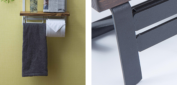 | タオルも掛けられる スチール素材のバーにはタオルなどを掛けておくことが出来ます。 | スチール素材 スチール部分には錆びにくくする、粉体塗装が施されています。 |
