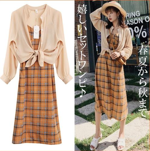 LAZA レディース L レトロ チェック ミモレ丈 キャミワンピ とろみ 前結び 長袖シャツ セット