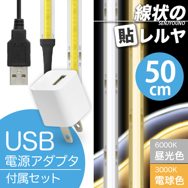 LED USB 照明 テープライト【USB電源アダプタ付】 線状の貼レルヤ(昼光色/電球色 50cm)明かりムラも無く美しい 一本線の光