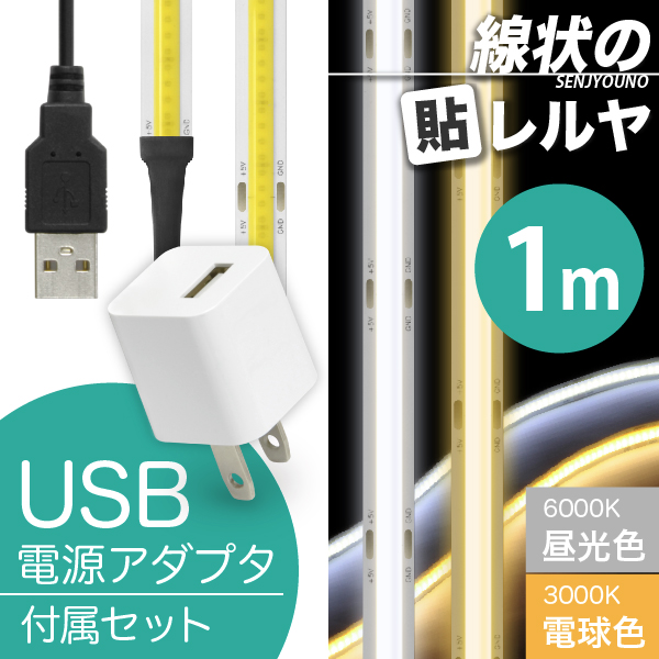 LED USB 照明 テープライト【USB電源アダプタ付】線状の貼レルヤ(昼光色/電球色 1m)明かりムラも無く美しい 一本線の光