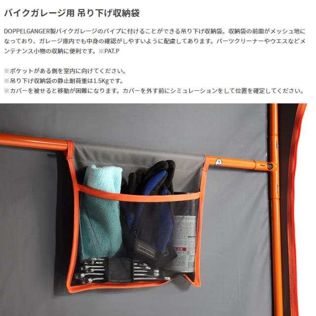 DOPPELGANGER製バイクガレージのパイプに付けることができる吊り下げ収納袋。収納袋の前面がメッシュ地になっており、ガレージ庫内でも中身の確認がしやすいように配慮してあります。パーツクリーナーやウエスなどメンテナンス小物の収納に便利です。※PAT.P