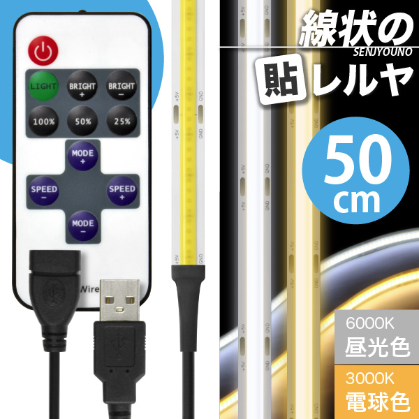 LED USB 照明 テープライト【リモコン式 USB延長ケーブル付】線状の貼レルヤ(昼光色/電球色 50cm)明かりムラも無く美しい 一本の光