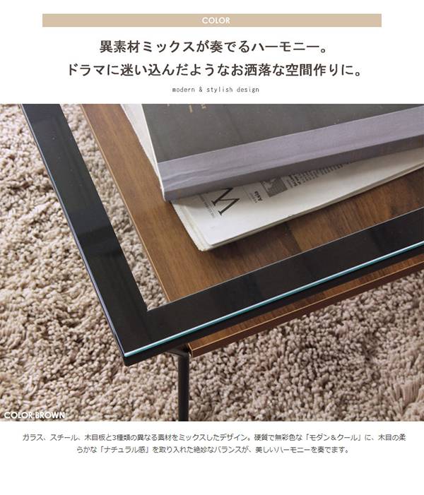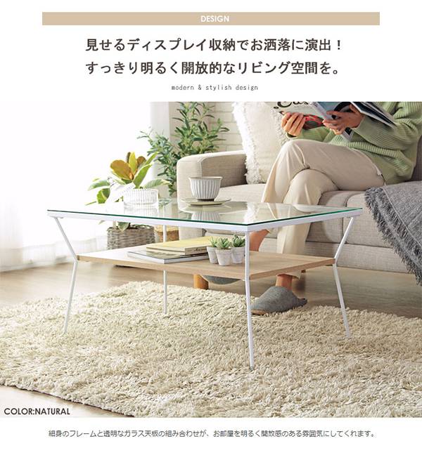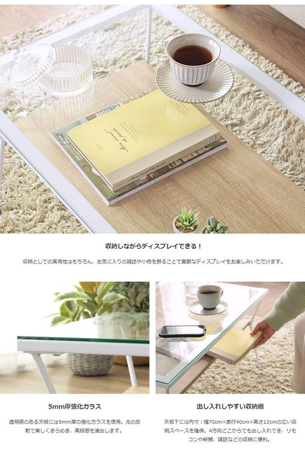 ガラス天板下にディスプレイ収納できる棚を設け、飾りながら収納できるお洒落なリビングテーブル。