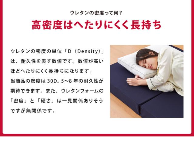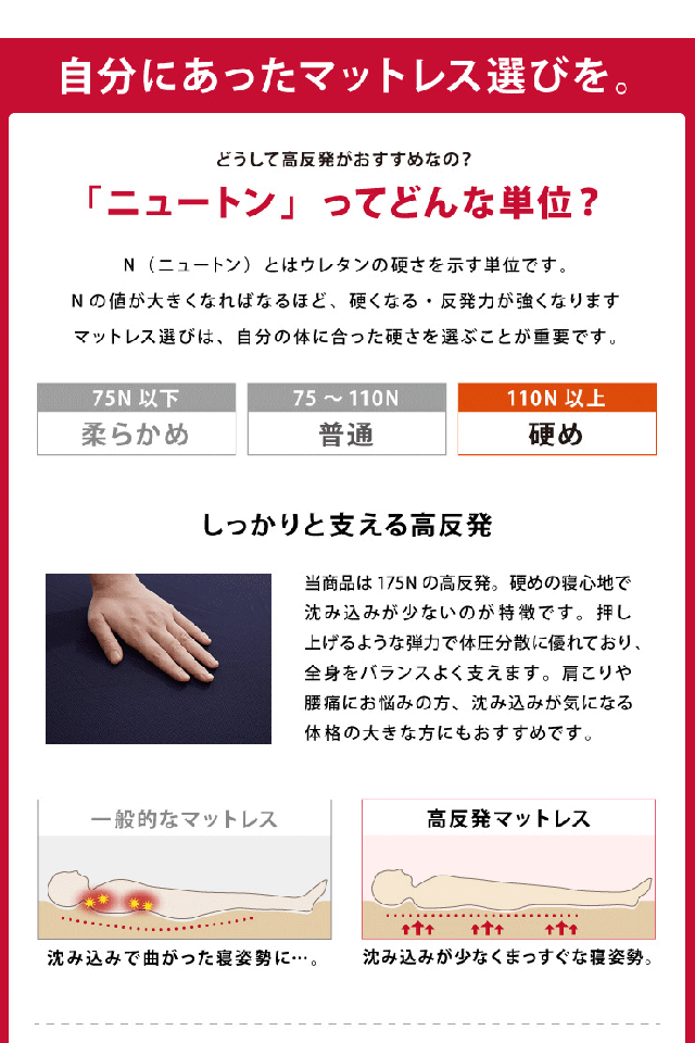 高密度、高反発の極厚ウレタンで寝心地アップ。175Nの硬さで体圧分散を促進します。ニット生地を使用。