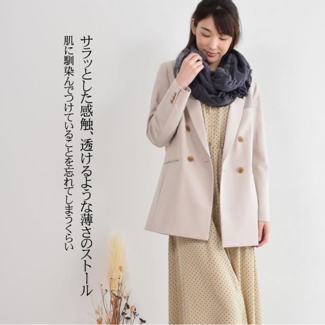 中国内モンゴル産のカシミヤは、その品質の高さにおいて格別。軽くて薄手のカシミヤは、デリケートで柔らかな風合いを味わうことができ、優しく空気を纏うような暖かさで保温性にも優れています。春先の肌寒さを防ぎ、夏の冷房除けにもなる、冬だけでなく通年で活躍するカシミヤのストール。優しい光沢とヌメリ感のあるストールは、大判でも巻いたときにゴロンと大きくなることがなく使いやすい。また、薄くて、軽やかなので重たく見えないのが魅力。巻き方次第でニュアンスを変えて楽しめます。小さくたためるので持ち運びにも便利です。