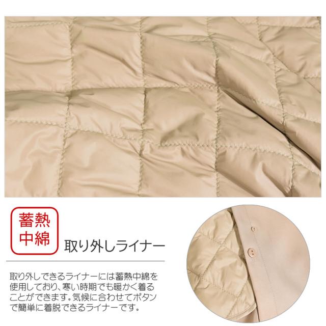 シーンを選ばずに使え、セレモニーなどの行事にも欠かせないベーシックトレンチ。取り外しできるライナーには蓄熱中綿を使用しており、肌寒い季節でも暖かく着ることができます。シワになりにくく、微光沢感がプラスされた上品な印象に仕上げられ、きちんと感もあるのでどんな装いにも合わせやすいシルエットに仕上げています。春先から秋まで長い時期で活躍。花粉付着防止加工、弱撥水加工を施された機能性も魅力的なコートです。