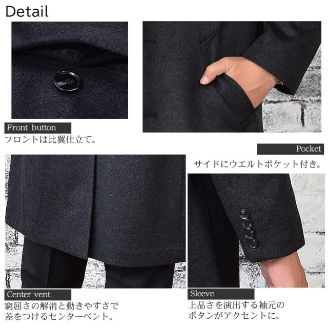 | 商品説明 | できる男のアウターとして人気のステンカラーコートをスタイリッシュに仕上げた一枚。ビジネスシーンはもちろん、カジュアルスタイルでも大活躍する一着です。マフラーを巻いたり、 |