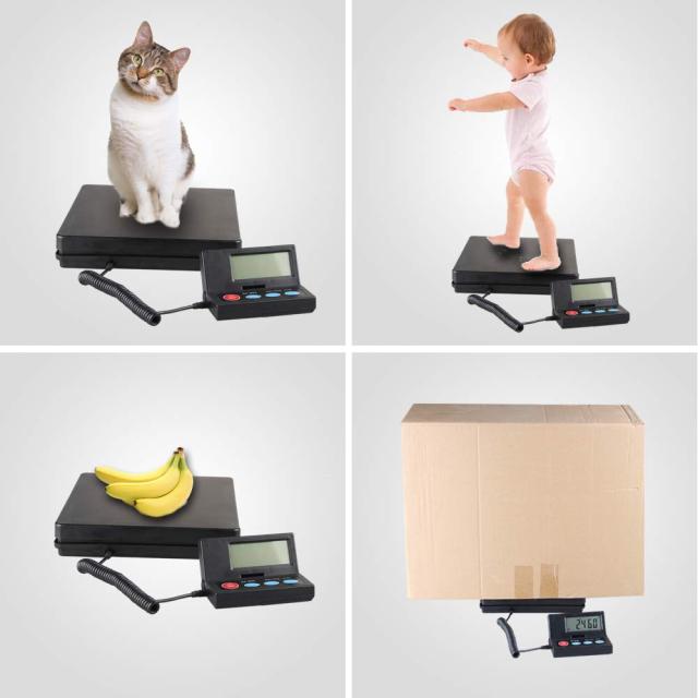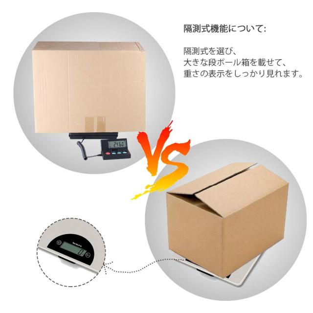 隔測式を選び、大きな段ボール箱を載せて、重さの表示をしっかり見れます。風袋引き機能、オートパワーオフ機能(約1分)、ブルーのバックライトが点灯して見やすい表示。