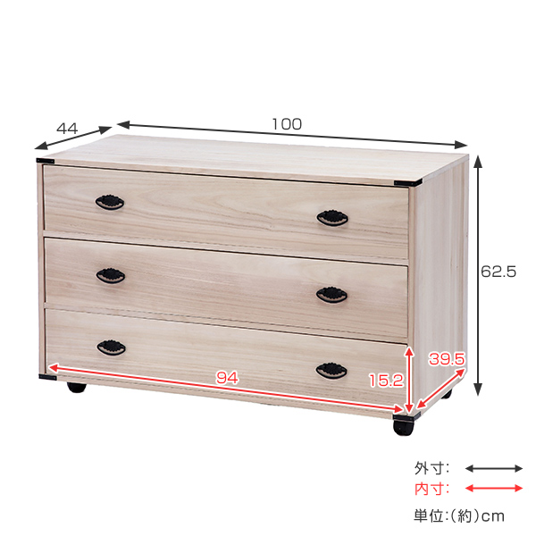 桐チェスト 3段 クローゼット収納 キャスター付 幅100cm ( チェスト 桐たんす 桐 タンス たんす 箪笥 桐箪笥 桐タンス 桐衣装箱 和箪笥 キャスター 着物 衣類収納 着物収納 幅100 完成品 )