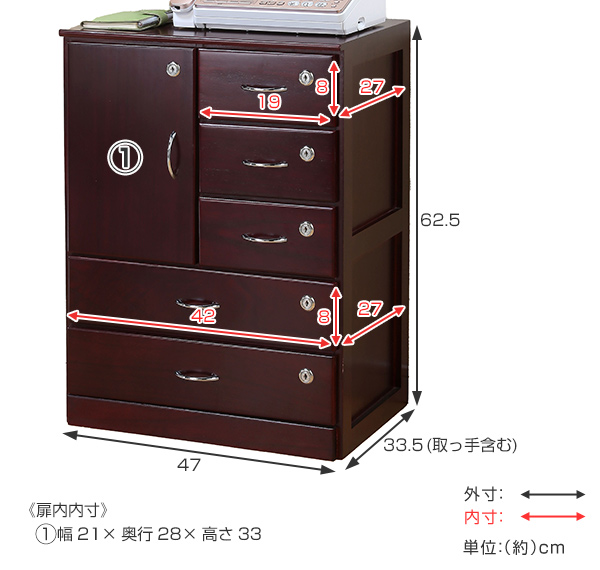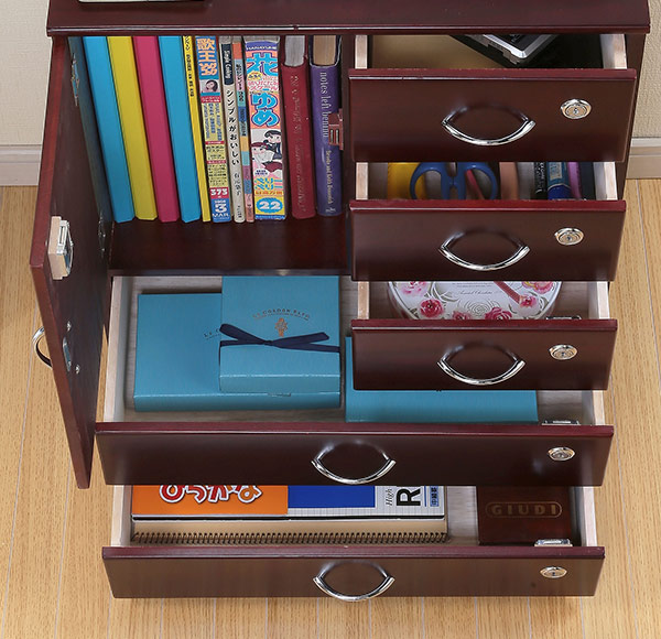 ●扉内と、大小5段の引出しがあり、全てに鍵がかけられるので、大切な物を安心して収納できます。
