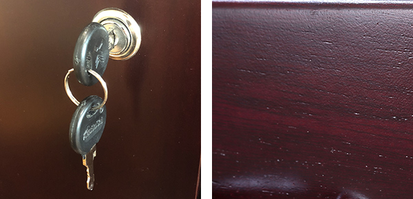 ●扉部分と引出し全段に共通の鍵が2個付いています。