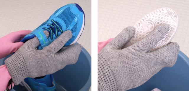 お子様の上履きやスニーカー洗いにもお使いいただけます。靴裏のでこぼこに入り込んだ汚れも、指先でこすって落とせます。