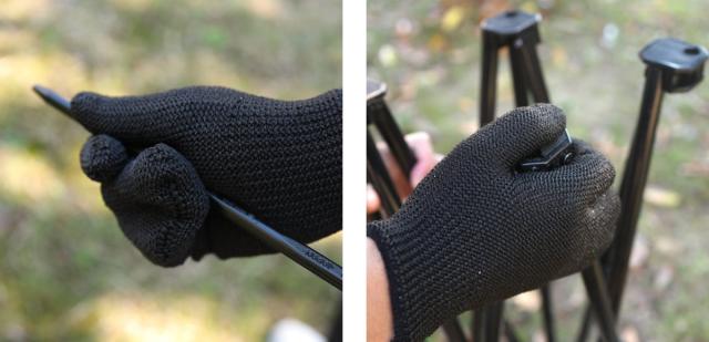 テントを固定するペグや、イスやテーブルの脚に付いた土を落とすのにも便利に使えます。手袋たわしがあれば、レジャーを楽しんだ後の片付けが楽ちんです。