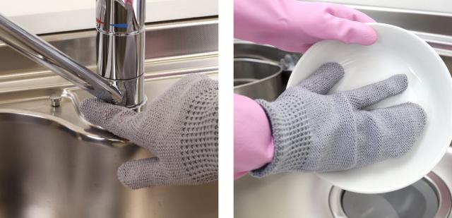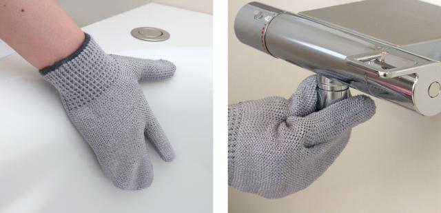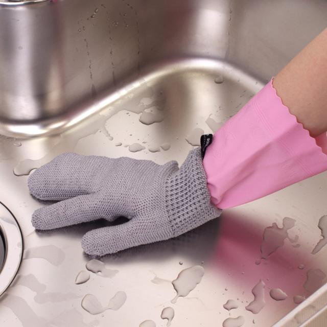 水だけで汚れを落とす、手袋型のたわしです。細かな溝や隙間にも届きやすく、つまんで洗うなど幅広い掃除用途に適しています。和歌山の手袋職人のこだわりが詰まった便利なお掃除アイテムです。
