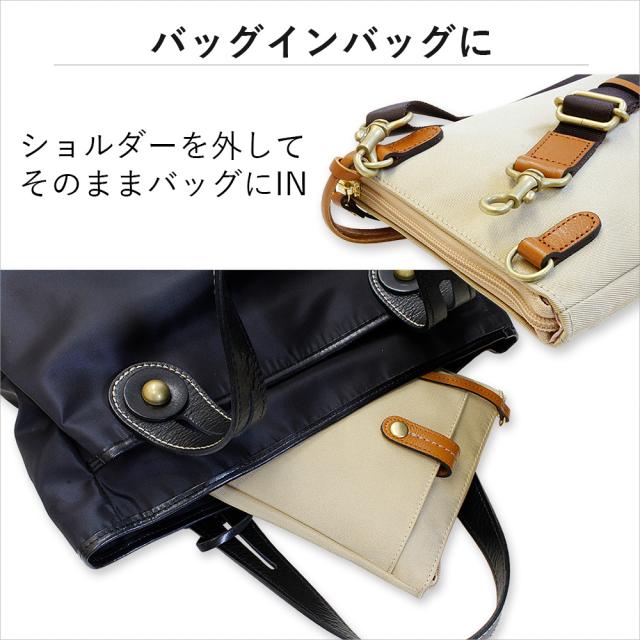 ショルダーを外してバッグに入れればそのままバッグインバッグとして小物ポーチになるので、旅行やお出かけ時にはスタイルを変えていつでも活躍します。