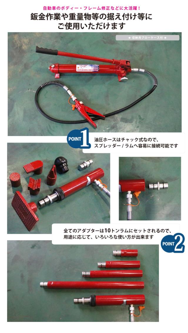 自動車のボディー・フレーム修正などに大活躍! ●油圧ホースはチャック式でスプレッダー/ラムへ容易に接続可能 ●全てのアダプターは10トンラムにセットされます ●用途に応じてチョイスして下さい ●スプレッダー/ラムはスプリングリターン方式 ●収納用ブローケース付 保証期間:6ヶ月 使用状況によっては保証対象外となる場合がございますので返送前に 必ずお問い合わせください (保証対象:油圧系統にかぎります) (保証対象外:[例]ダメージやオーバーロードによる変形・ゆがみ等、 使用による車輪の摩耗・水、塩分に起因する故障) 返送の送料はお客様負担でお願いいたします お客様によるイメージ違いでの返品は一切お受け出来ませんので予めご注意ください 【部品のお取り扱いもございます】 ★KIKAIYA 油圧ポンプ 小 油圧ホース付き(YP-10) ★KIKAIYA ポートパワー10トンシリンダー(PP-10C) 品番:PP-10 |