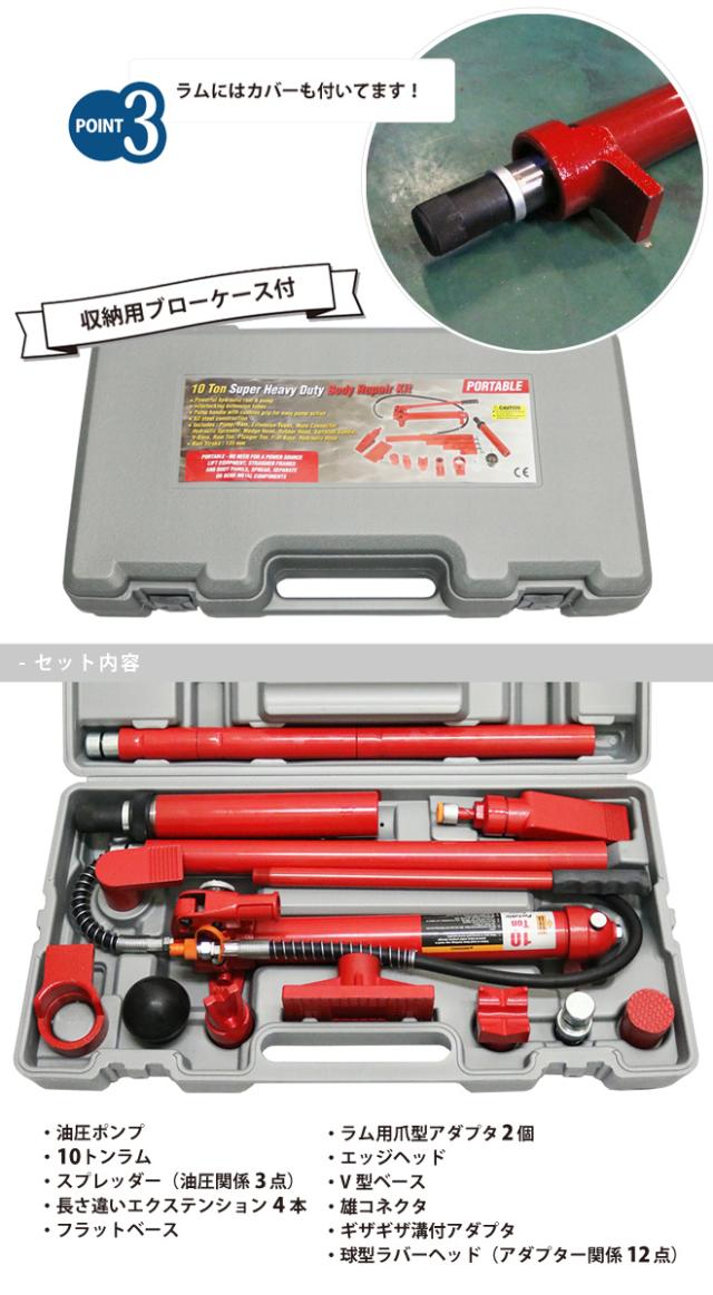 | セット内容 | ・油圧ポンプ(YP-10) ・10トンラム ・スプレッダー(油圧関係3点) ・長さ違いエクステンション4本(100、200、300、550mm) ・フラットベース ・ラム用爪型アダプタ2個 ・エッジヘッド ・V型ベース ・雄コネクタ ・ギザギザ溝付アダプタ ・球型ラバーヘッド(アダプター関係12点) ・収納用ブローケース付き |