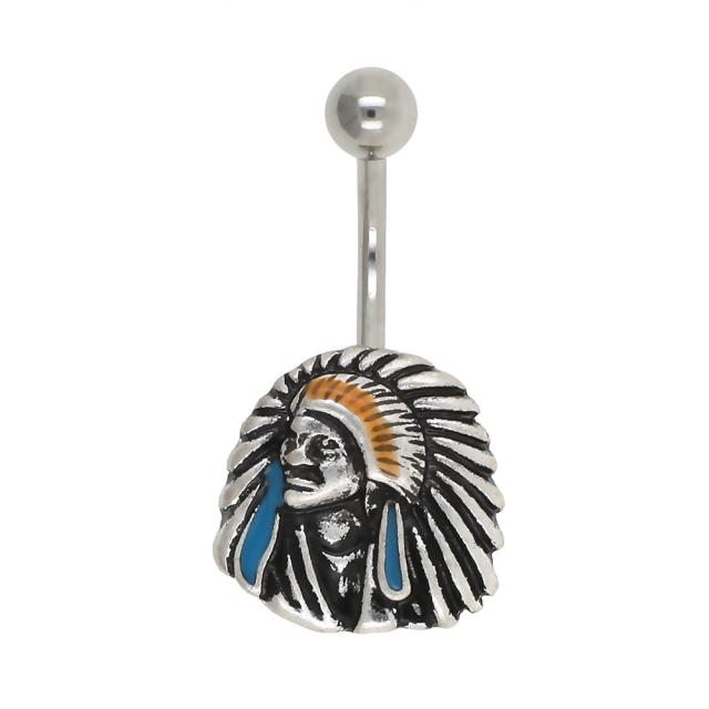 ステンレスカラーの銀色の14ゲージのカーブバーベルに羽飾りを付けたインディアンをモチーフにしたかっこいいヘソピアス型ボディピアス。