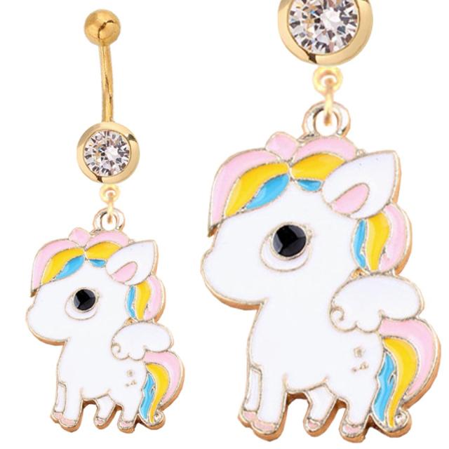 可愛い虹のようなタテガミのユニコーンをデザインしたチャームをクリスタルのジルコニアをセットした14ゲージの金色のバナナバーベル型の臍ピアスにつないだボディピアス。