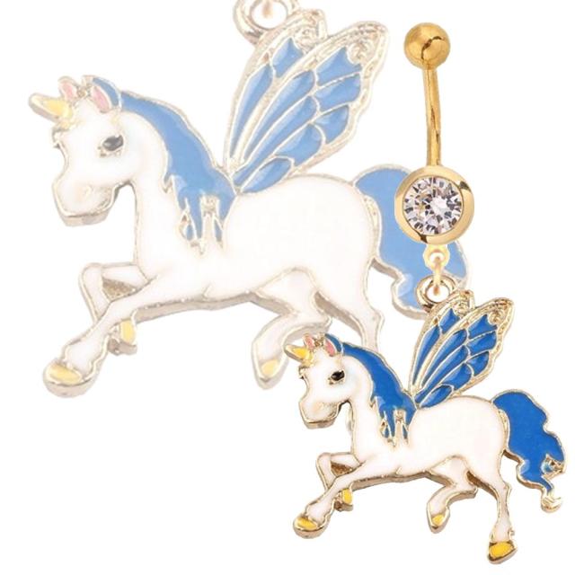 青色の翼とタテガミの天馬ペガサスをデザインしたチャームをクリスタルのジルコニアをセットした14ゲージの金色のバナナバーベル型の臍ピアスにつないだボディピアス。