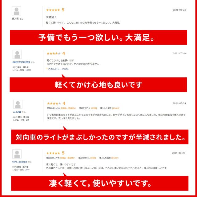 - 軽くてかけやすいです。長時間付けても疲れません。思っていたより色が濃いいように感じます。