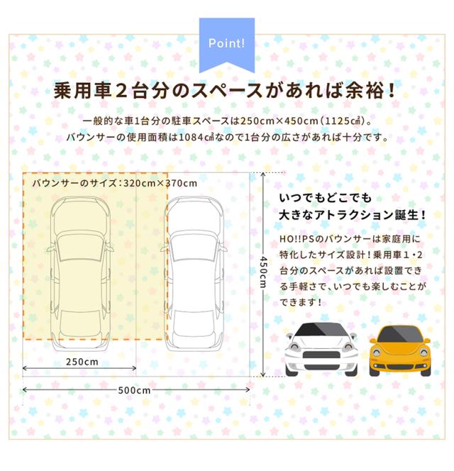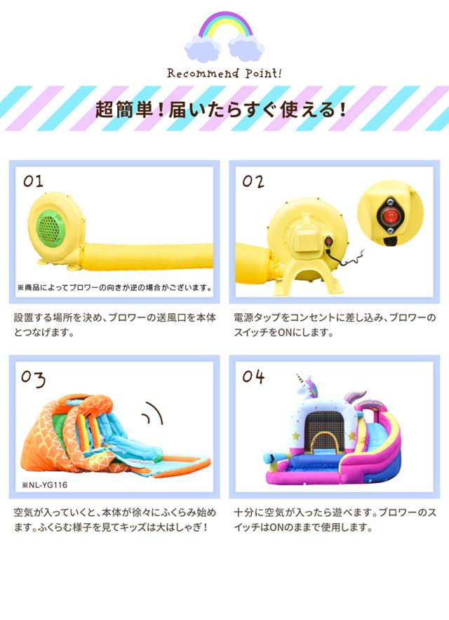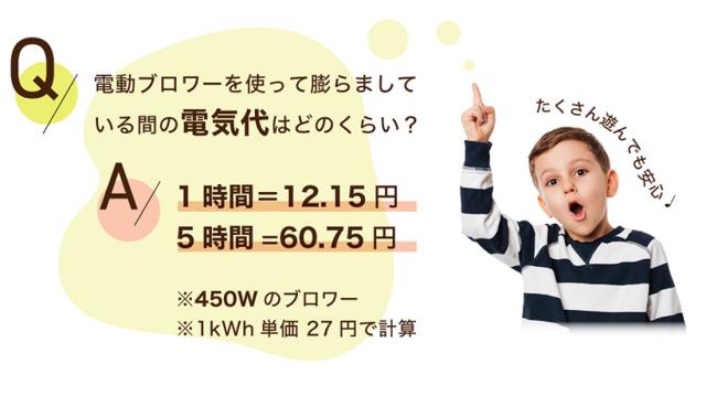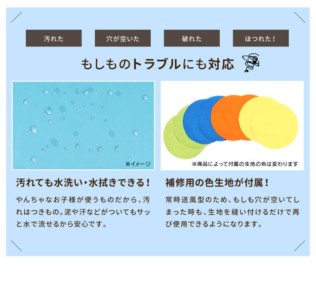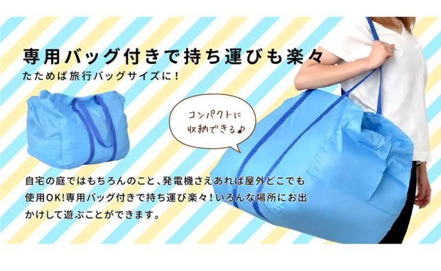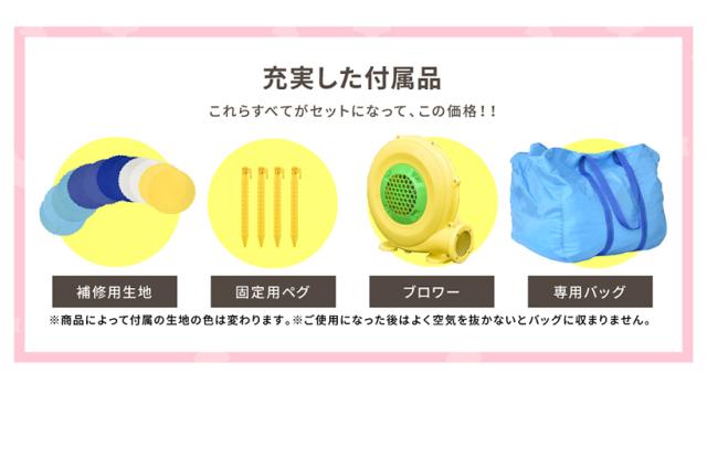 | 付属品 | 専用ブロワー(450W)、固定用ペグ、修復用生地、バッグ、本体用ホース、取り扱い説明書 |