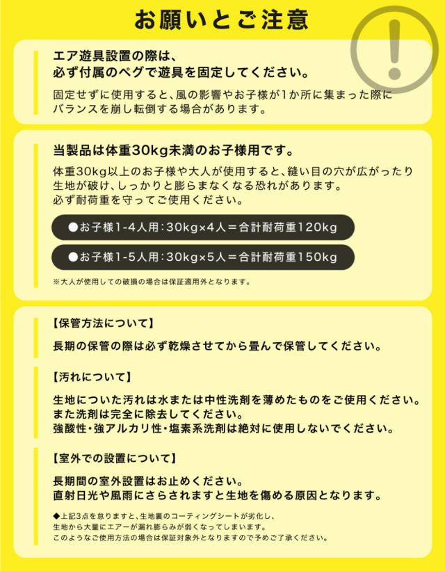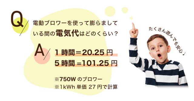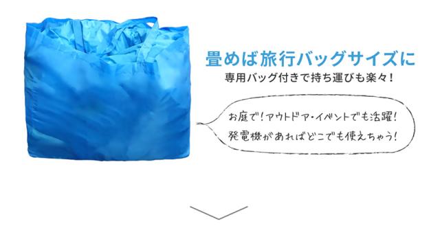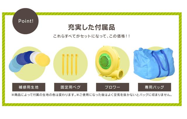 | 付属品 | 専用ブロワー(750w)、固定用ペグ、本体用ホース、修復用生地、バッグ、取り扱い説明書 |