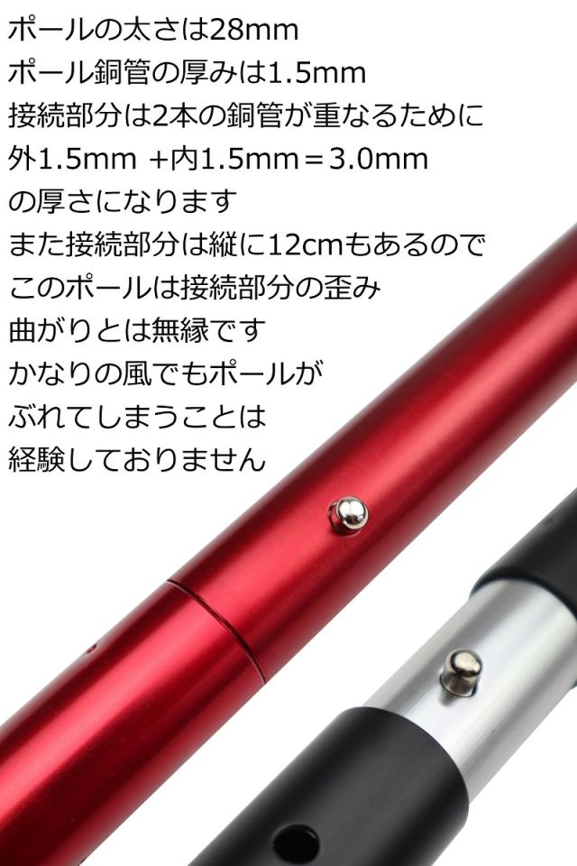 ポールの太さは28mm、ポール銅管の厚みは1.5mm、接続部分は2本の銅管が重なるために 外1.5mm +内1.5mm=3.0mmの厚さになります。また接続部分は縦12cmもあるので、このポールは接続部分の歪み、曲がりとは無縁です。